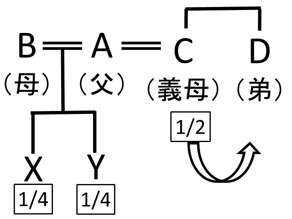 Aさんが調べたところ、Aさんが遺言を残さずに亡くなった場合、Aさんのご家族は、Cさん:Xさん:Yさん=1/2:1/4:1/4の割合で相続することが分かりました(法定相続)。